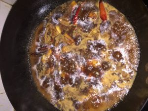 排骨上倒入一小勺老抽,两勺生抽,翻炒一下倒去开水,快淹没排骨。