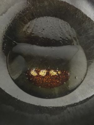 锅里倒入油,中火,放入冰糖,七八粒,中小火等冰糖溶化