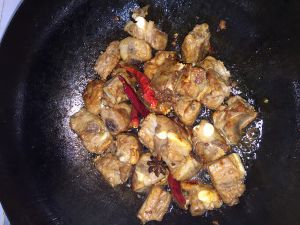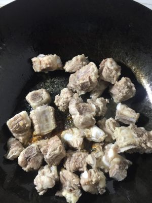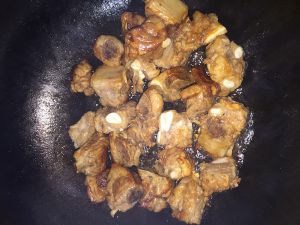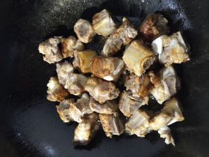 排骨倒进去,翻炒,尽量不要有水,要不然到进去之后,热油乱溅,小心烫伤