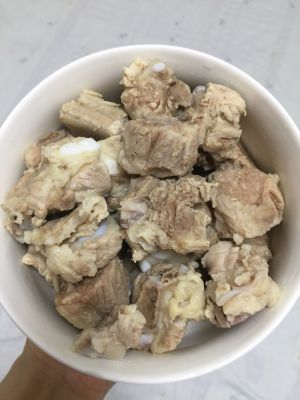 排骨切段。在开水里面煮10秒,去掉肉的血腥味,然后捞出来控水,不要有什么水