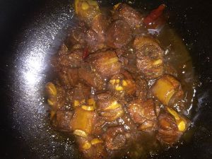 再炖十五分钟让排骨入味,再加入切好的土豆,中火收汁
