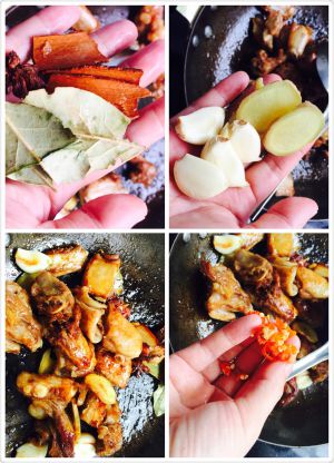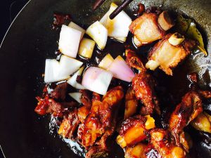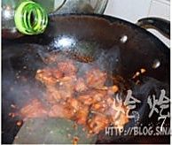 锅里放油,把冰糖放在锅里炒糖色,糖都有焦色时下排骨翻炒,然后吧所有的配料都放在锅里一起炒,