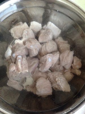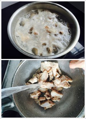 锅里添水煮开,排骨倒里面煮3至5分钟,淤掉排骨表面的脏东西➕油