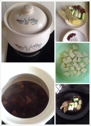 葱切段,两片香叶,姜切片,八角,花椒,可放桂皮,主要还有冰糖哦。做红烧一定要放冰糖炒化。把排骨放锅中炒的图片忘记拍了。炒完放提前预热了一会儿的砂锅里煮开,转小火慢炖1个半至2个小时。看肉烂的程度,假如一根筷子可勉强插烂肉,可加土豆块再中火炖会转小火,等待肉和土豆一起缠绵,方可出锅。
