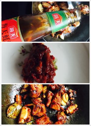 排骨煸炒至颜色变深,倒入适量的醋(喜欢吃酸点的就放多点,不喜欢太酸的就少放点)。