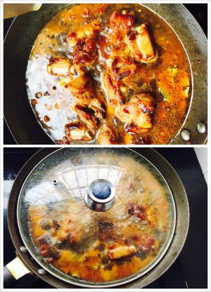 加入热水,放点醋大火烧开,盖上锅盖转小火焖30分钟,此时排骨以熟烂。