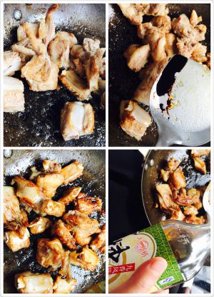 上锅,油,热了,倒入排骨,排骨走了热气后,加糖,老抽,起劲翻炒,上色,