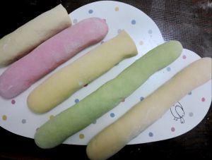 面团盖上保鲜膜,醒10分钟,撕一块面团揉长条状。