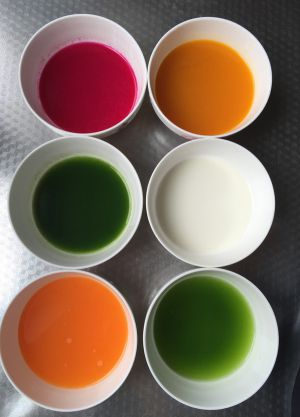 打成果汁,白色那碗是牛奶,本来想用菠菜做个深绿浅绿呢,最后和面菠菜汁不够啦