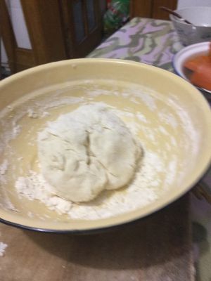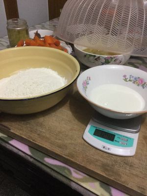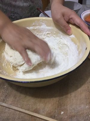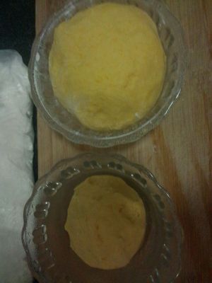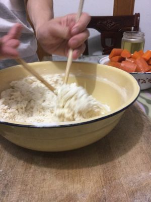 2.南瓜蒸好后,碾烂,倒入面盆里,搅拌均匀。然后用手来揉。一边揉一边加水。