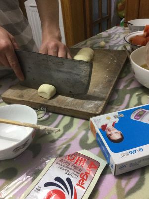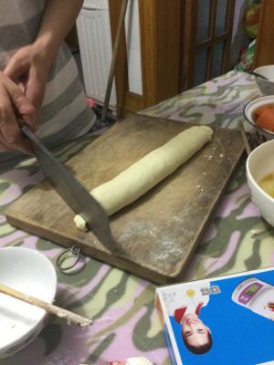 4.哇,面团发得很好,2倍大了,拿出加点粉继续揉。然后弄成长条装的,我做刀切馒头。