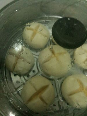 5.切好后,放入抹了油的蒸盘里,不能放得太密。要留多点空间给面团长大。把锅里的水加热下,然后关火,把蒸盘放上,盖上锅盖,进行二次发酵,大约20分钟。接着留可以开火蒸15-20分钟啦。