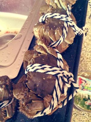 将蟹逐只洗净,放入水中养半天,使其排净腹中污物,然后用细绳将蟹钳、蟹脚扎牢;