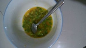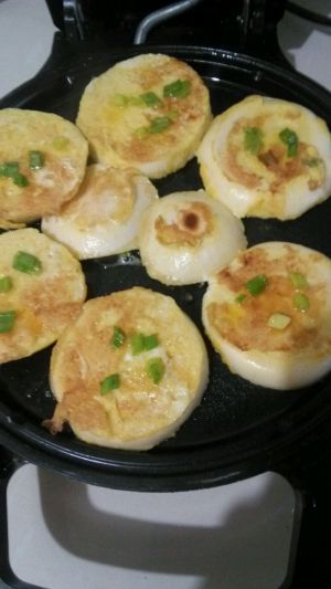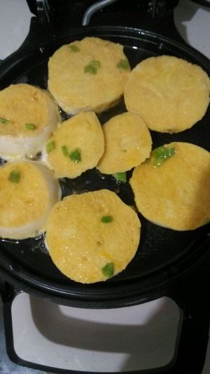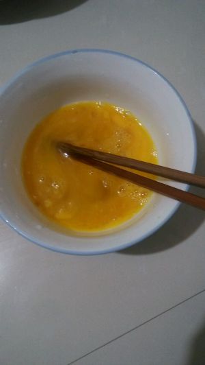 馒头片在蛋液中翻滚。让蛋液浸入馒头片就可以啦!