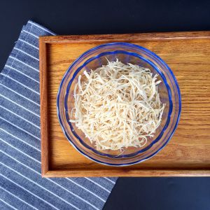 煮好的鸡胸肉放入冰水,凉透之后撕成细条 黄瓜切丝,与豆芽一起放到鸡丝上
