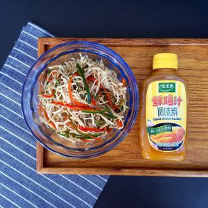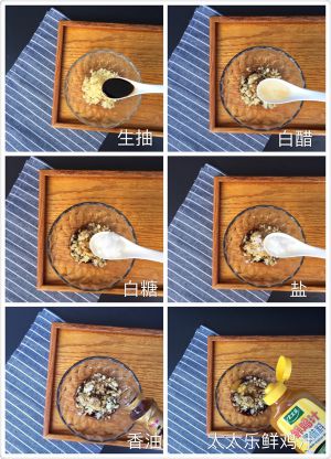 准备调料酱汁:蒜末适量、一勺生抽、一勺白醋、一勺白糖、一勺盐、少许香油、适量太太乐鲜鸡汁、一勺凉白开水,搅拌均匀即可