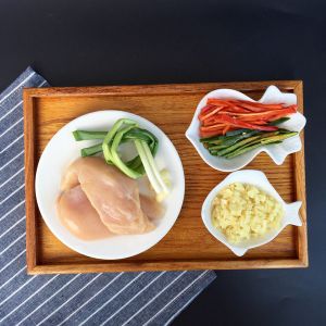 材料准备好:青红椒切丝、蒜末、葱、鸡脯肉切洗净小块(顺着纹路切)