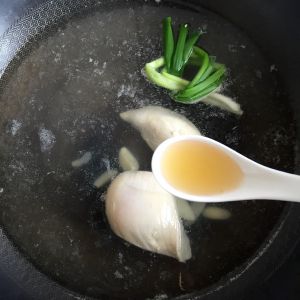 鸡胸肉,蒜葱,加一勺料酒加盖煮3-5分钟熟透即可