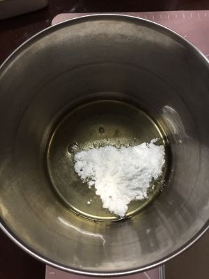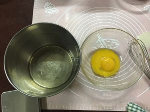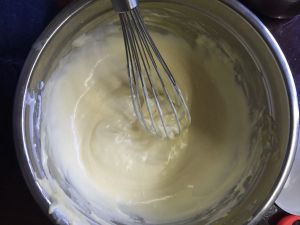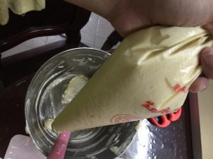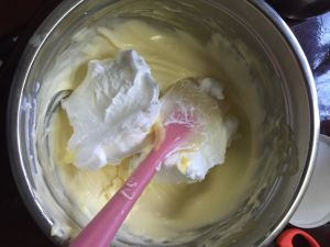 糖水沸腾以后关火,一边用打蛋器搅打,一边缓慢倒入打发好的蛋黄,蛋黄倒入完毕以后,继续用打蛋器搅打,打3-5分钟左右,此时蛋黄糊的温度应该已经降下来,和手心温度接近。把冷却后的蛋黄糊倒入大碗里备用。(蛋黄糊必须完全冷却以后才能使用)