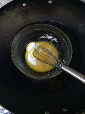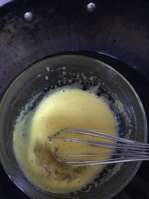 2.水和糖煮沸,关火,将蛋黄倒入其中,一边倒一边打,使其冷却