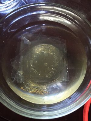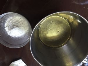 把泡软的吉利丁片滤干水分后,隔水融化,使之融化成吉利丁溶液。
