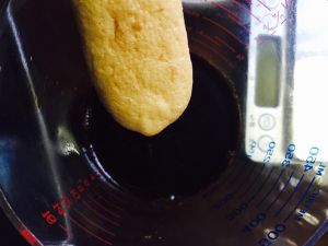 6.将朗姆酒和咖啡混合,用手指饼干泡一下,装入容器,倒入马斯卡朋