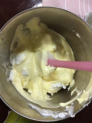 马斯卡彭芝士打好以后,和蛋黄糊混合拌匀。