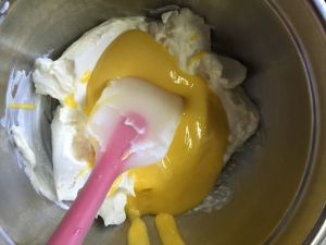 3.将马斯卡朋打滑,将蛋黄加入,打匀
