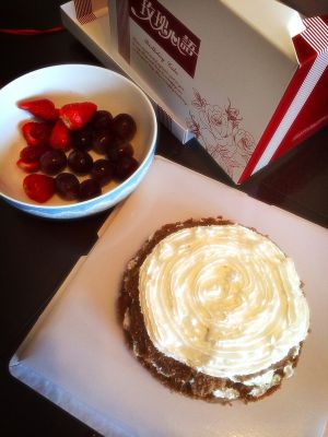 烤好的蛋糕片完全放凉后(大约20分钟左右)先刷一层朗姆酒咖啡液(混合10g朗姆酒和30g咖啡)。然后挤上冷藏好的奶酪夹馅,卷成卷放冰箱冷藏定型(20分钟以上)