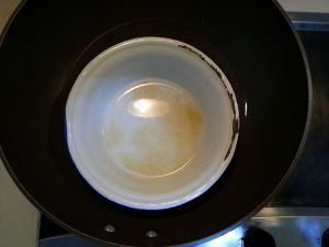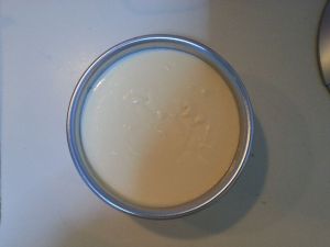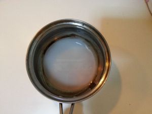 差不多打到这个样子。然后把60g纯净水中加入35g白砂糖,放入锅中加热,小火,中途要不停地搅拌。煮至沸腾,关火。