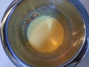 加入糖水的蛋黄液颜色更淡,体积增加。放置备用。