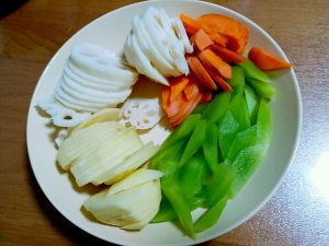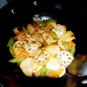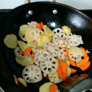 锅中放稍多油,放入拍好的大蒜,花椒(如果吃辣,这时候放干辣椒)爆香,依次放土豆片,炸脆,再放藕片稍微炸一下,胡萝卜,莴笋