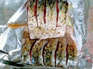 买的草鱼比较大,所以切了两段肉肉,如果是买的两三斤左右的鱼,就直接劈开抹上盐腌一会,将糖,生抽,五香粉,蒸鱼豆豉等佐料调成酱汁抹在鱼肉上,最后刷油,进烤箱180度烤中上层15分钟(因为我的鱼大,切的肉也比较厚,所以烤了10分钟后又加了5分钟。大家按鱼大小和自家烤箱温度调节)