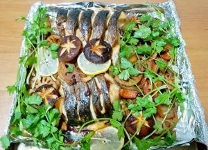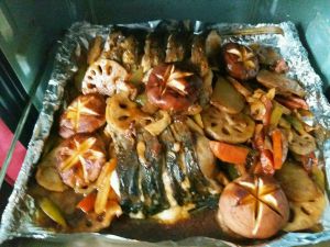 鱼烤好后从烤箱取出,把煮好的配菜倒在鱼上,记得把汤汁浇在鱼身的刀口上,这样更入味。