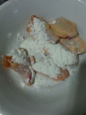 将腌制好的鸡翅放入面粉中,反复按压7次,看鸡翅表面均匀的包裹着面粉,然后拿出鸡翅放入清水中,迅速捞起,左右摇晃下,沥干水分,这时候你会看到鸡翅外表上变成面糊状了。放回面粉中进行第二次按压,鸡翅外层裹满面粉就可以了