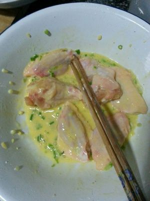 锅中放油 油热后 将鸡翅裹上面糊 放入锅中炸制 颜色金黄即可