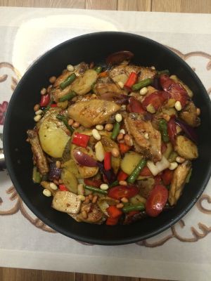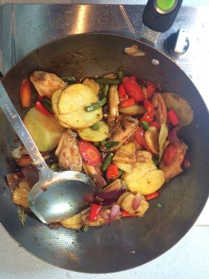 加进煎好的鸡翅、土豆,混合炒一会儿,喷点生抽,起锅