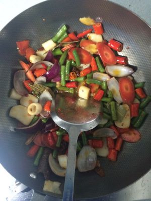 放入棒豆、洋葱、胡萝卜、年糕一起炒,放适量盐