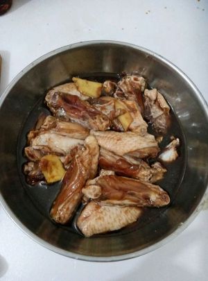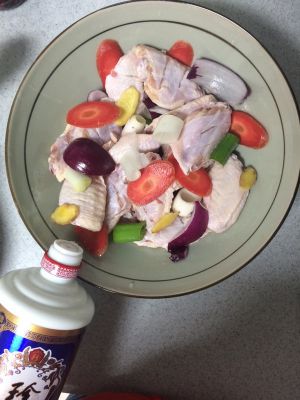 腌鸡翅30分钟:放入姜片、大葱节、胡萝卜、洋葱、料酒、白酒、适量盐
