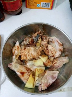 加入老抽,生抽,白酒,料酒,白胡椒,白糖生姜片去除腥味,腌制半小时以上入味。