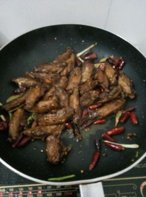 放入油炸好的鸡翅,爆炒!加入少许料酒。少许食盐。