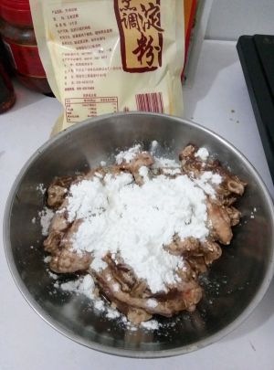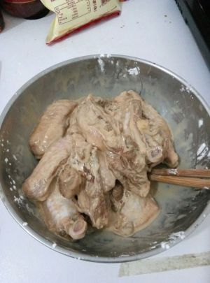 方法①加入玉米淀粉搅拌。或者方法②一个一个鸡翅的裹满淀粉油炸。效果不一样。建议方法②。油炸时候走酥脆敢,并且油炸不溅油。我今天做的是方法①。