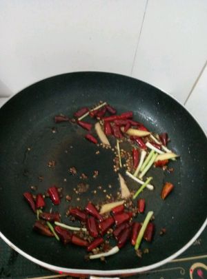 放入红尖椒、姜蒜、花椒、八角、香叶、桂皮、花椒,炒制出香味