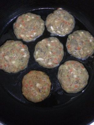 保持中小火先煎一面,可轻微移动饼,当底面煎 得有一点硬后,再翻至另一面。为防止煎焦,间隔可翻面3-4次。煎大概8分钟左右,虾饼会膨胀,饼皮呈现金黄色
