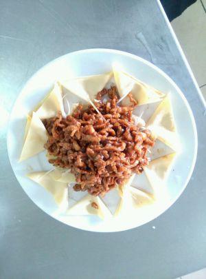 百叶过热水抄熟,肉丝出锅,用百叶包着肉丝和京葱即可。