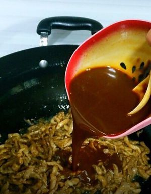锅内留底油,倒入调好的酱汁,小火翻炒至冒泡后倒入炒好的肉丝转大火快速翻炒均匀后倒入1匙香油翻炒均匀关火盛出。