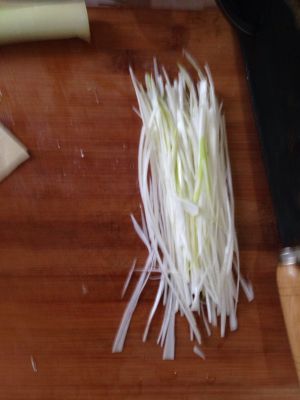 大葱去掉绿色部分,只取葱白,洗净后切成4厘米长的段,再对半切开后,切成细丝,放入盘中摆好。