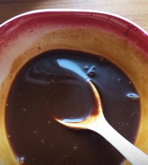 倒入酱料,酱料的比例是:三勺甜面酱、五勺清水、半勺糖