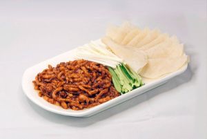 锅里留少量油,将葱、姜末爆香,然后加入秘制甜面酱2勺,煸炒出香味;放入以滑熟的肉丝,快速翻炒几下,立即出锅。用饺子皮把猪肉和蔬菜丝包起来一起吃即可。