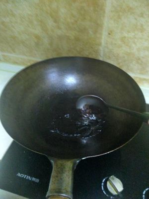 锅中放入油,油热后放入甜面酱,小火翻炒一会(15秒钟左右),依次加入葱姜水:3勺、鸡精:四分之一勺、料酒:1勺、白糖:1勺,不停的翻炒,待白糖彻底融化,